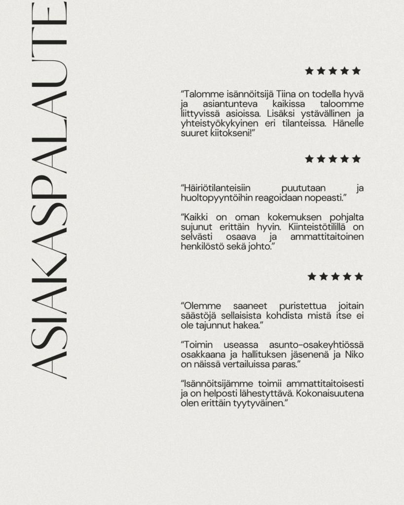 • Tavoitettavuudesta: vastaamme ripeästi, kun meitä tarvitaan. Isännöitsijämme ovat helposti lähestyttäviä.