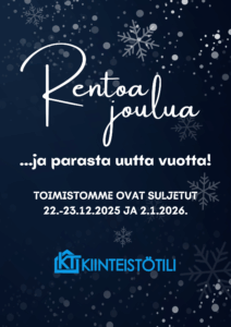 Jouluviikolla (22.-26.12.), uudenvuoden päivänä 1.1.2026, perjantaina 2.1.2026 sekä loppiaisena 6.1.2026 toimistomme ovat suljetut. Kiireellisissä taloyhtiön huoltoasioissa auttaa huollon päivystäjä (yhteystiedot löytyvät yleensä taloyhtiön alataululta tai